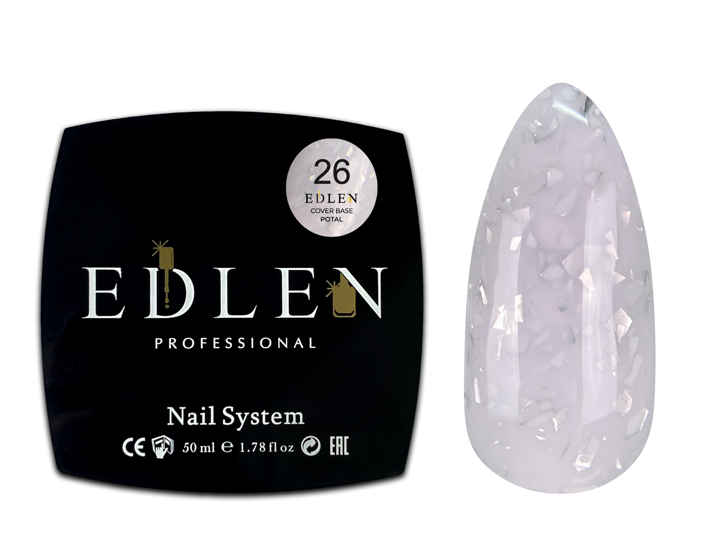 Cover base Potal Edlen – колекція камуфлюючих баз Edlen з шматочками поталі. Тепер базами можна не тільки вирівнювати, а й виконувати дизайни, адже достаньо тільки нанести вирівнюючим шаром Cover base Potal Edlen і ми швидко та легко отримуємо готовий, унікальний дизайн. Завдяки формулі та ідеальній концентрації поталі в базах, вони легко самовирівнюються та комфортні в роботі, а шматочки поталі рівномірно розприділяються по нігтьовій пластині.