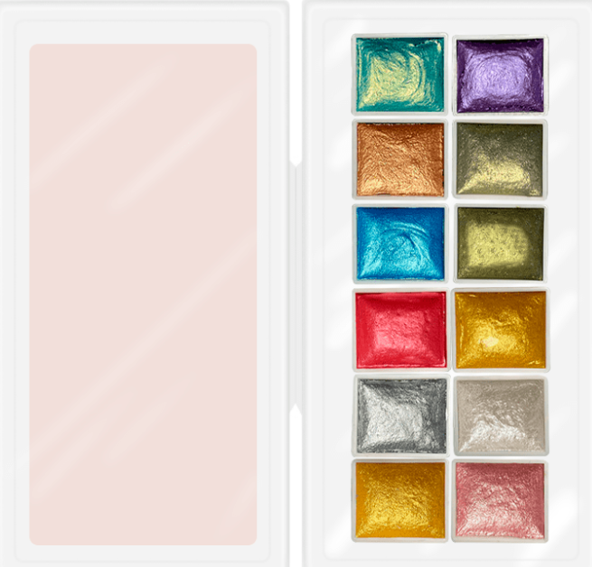 Набір акварельних фарб представлених з 12 перламутрових кольорів в кюветах. За допомогою них ви зможете створювати різнопланові малюнки з дуже цікавими напівпрозорими ефектами. Кольори можна змішувати між собою для отримання додаткових відтінків. Пігмент забезпечує насиченість, чистоту та прозорість кольорів. Вміст перламутрових частинок дає перелив під різними кутами заломлення світла.